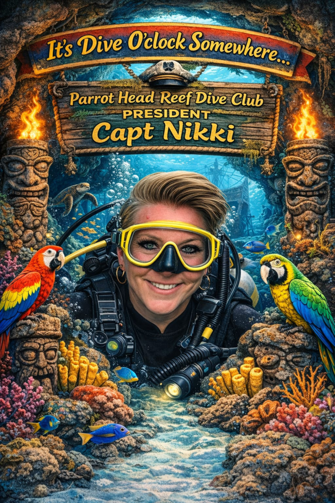 As the founding president of the Parrot Head Reef Dive Club, Captain Nikki leads the charge in bringing ocean lovers together from coast to coast. With a passion for marine conservation and a love for underwater adventure, she is building a movement that connects divers, beach enthusiasts, and environmental advocates.